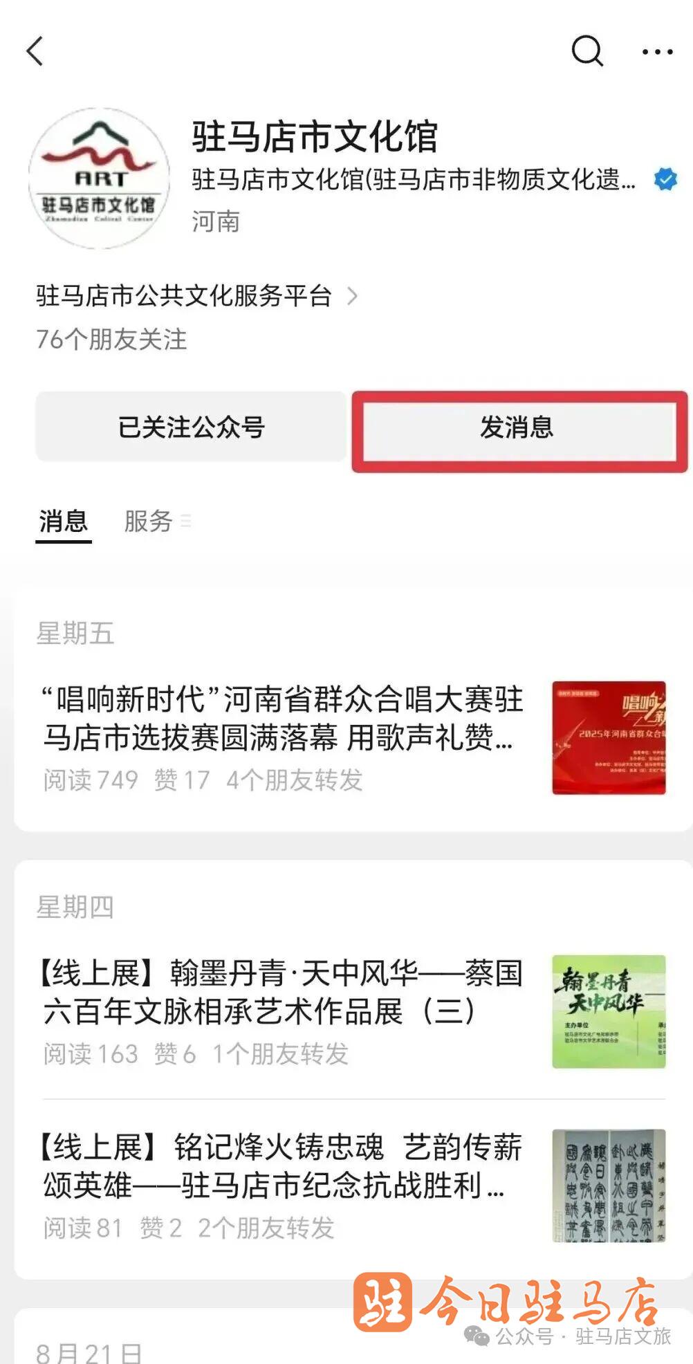第一步:關注駐馬店市文化館微信公眾號,點擊【發消息】